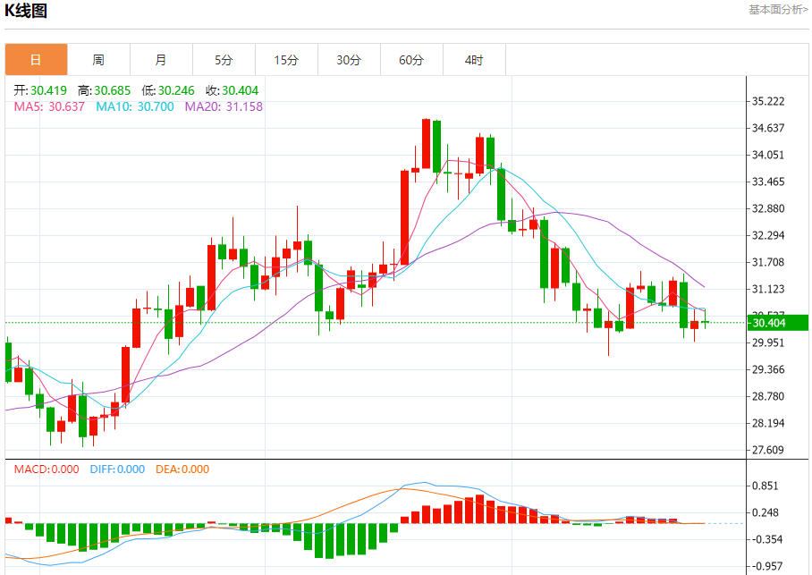现货白银:截止北京时间21:21,现货白银下跌,现报30.40,跌幅0.05%。纽市盘前,银价继续在关键阻力30.63美元处震荡,只要价格低于该水平,我们的看跌概览今天仍然有效,受EMA50形成的负压支撑,提醒您我们的下一个目标位于29.64美元。