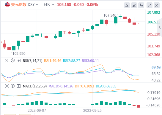 美元指数:截止发稿,美元指数交投于106.16附近。非农就业报告公布后,美元指数一度涨至 106.98 高点,随后大幅回落至 105.95 低点。目前投资者正等待本周公布的 9 月份消费者价格通胀和生产者价格指数数据,以及即将到来的季度财报季。摩根大通等主要银行将于本周发布财报。技术面上,考虑到目前的价格走势,美元暂时可能出现进一步涨幅。一旦该指数突破2023年的顶部107.34(10月3日),则可能鼓励多头挑战周峰值107.99(2022年11月21日),然后是整数关卡108.00。