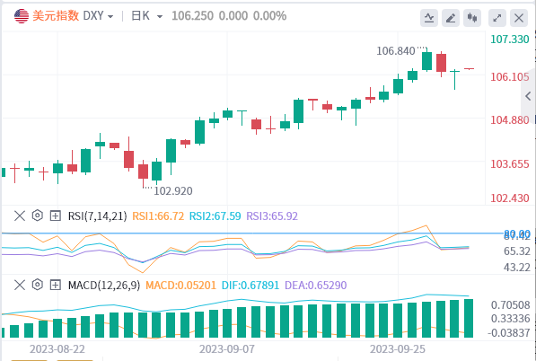 美元指数:截止发稿,美元指数交投于106.25附近。美元指数连续第 11周收高,并连续第二个月收高。此前,该指数从月度支撑位99.67处出现反弹。技术面上,尽管日线图上的RSI测试了超买空间的实力,但支撑位的重新测试在周五吸引了逢低买盘。尽管RSI正在挑战其超买区域,但该指标在趋势市场中可能会长期保持超买状态。注意到月度范围内有接近更高区域的空间,再加上上周日线图上重新测试支撑,进一步买盘可能会将指数拉向上周顶部106.84,作为初始盈利目标,突破后将发现日线阻力位107.61。