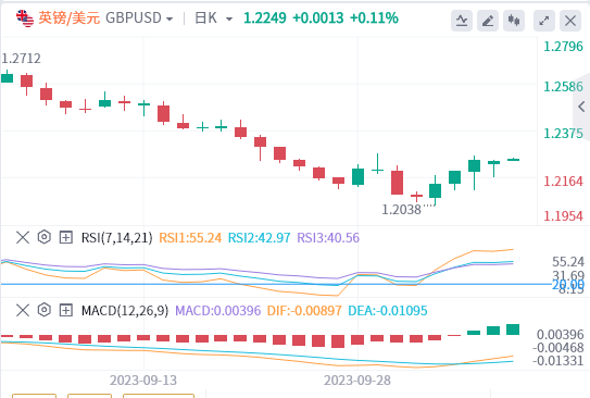 欧元:截止发稿,欧元/美元徘徊于1.0576附近。上周五欧元/美元上涨,收报1.0584,涨幅0.36%。欧洲10月Sentix投资人信心指数为-21.9,较前值-21.5略为下滑,但明显优於期值-24。周二欧央行行长拉加德将发表讲话,她将在国际货币基金组织(IMF)目前正在摩洛哥举行的最新年会上发表重要讲话。技术面上,欧元/美元在 1.0520 水平附近找到直接支撑。如果进一步下跌,1.048和1.044水平可能会成为额外的支撑。另一方面,阻力位预计在1.0600和1.0660。