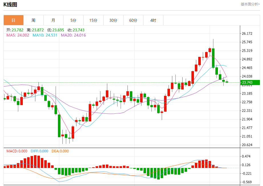 现货白银:截止北京时间21:20,现货白银下跌,现报23.743,跌幅0.15%。纽市盘前,银价在关键支撑位23.70波动,只要价格在这个水平之上,我们的看涨概览今天就仍然有效,它的下一个主要目标位于24.60,提醒你突破23.70将阻止预期的上涨,并推动价格转跌。