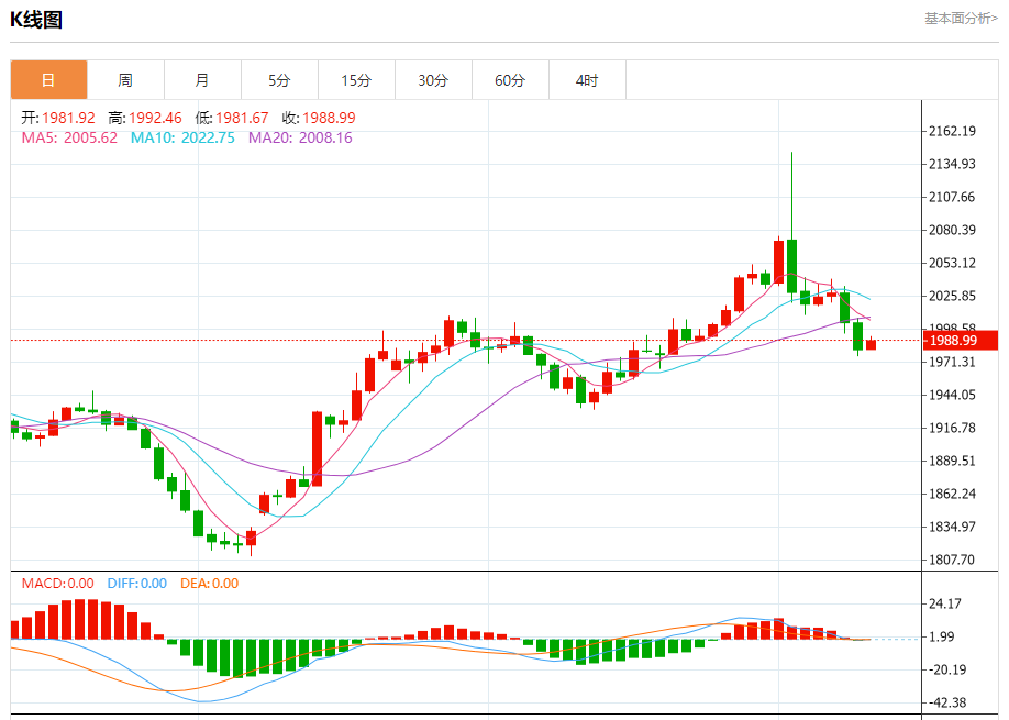 现货黄金:截止北京时间21:20,现货黄金上涨,现报1989.15,涨幅0.38%。纽市盘前,黄金价格自上午以来显示出紧张的交易,稳定在1977.46水平附近,等待突破这一水平,以确认将熊市波向1938.00延伸,作为下一个负面目标。