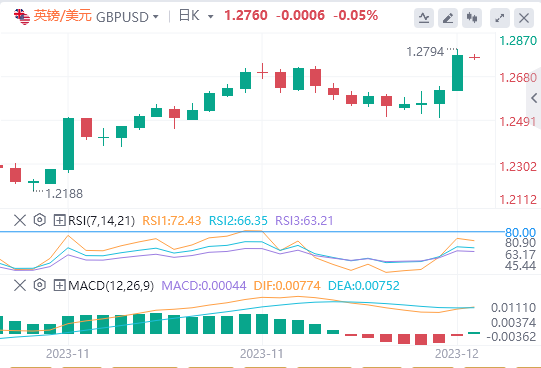 英镑:截止发稿,英镑/美元徘徊于1.2760附近。英镑/美元周四上升,收报1.2764,涨幅1.16%。英镑/美元在英国央行(BoE)最近的决定后飙升,并跃升至8月以来的最高点1.2755附近。英镑的快速上涨主要是由于央行的鹰派政策立场,这推高了英镑兑美元的价值。技术面上,汇价上行的初步阻力位于1.2835,进一步阻力位于1.2906,关键阻力位于1.3017;汇价下行的初步支撑位于1.2653,进一步支撑位于1.2542,更关键支撑位于1.2471。