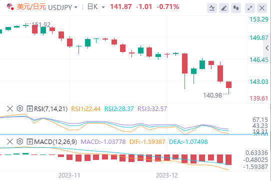 美元/日元大幅下跌,跌破142.00。截至记者发稿时,该货币对当日再跌近1%,报141.50附近。