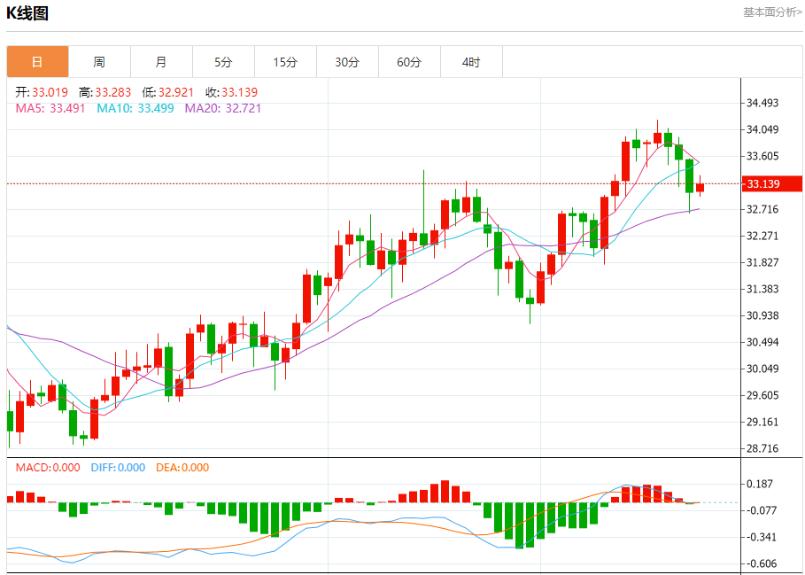 现货白银:截止北京时间20:20,现货白银上涨,现报33.143,涨幅0.43%。纽市盘前,银价在最近的盘中水平上涨,因为它试图收复最近的一些失地,同时也发泄了随机指标中的超卖饱和,其中出现了积极的信号。