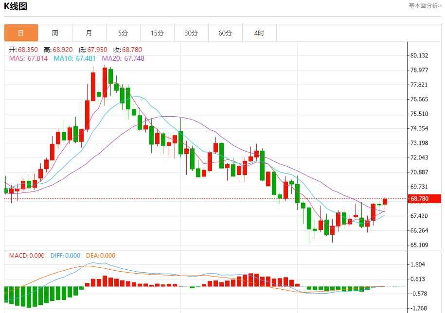 原油市场:截止北京时间20:20,美油上涨,现报68.75,涨幅0.69%。纽市盘前,美国原油价格在最新的盘中交易中扩大了涨幅,并确认突破了68.00美元的关键阻力,因为价格沿着趋势线交易,短期内向上修正趋势占主导地位,由于交易位于50蜡烛SMA上方,因此持续受到支撑。