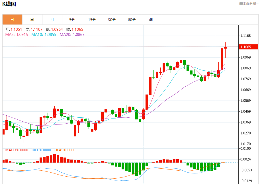 欧元/美元:截止北京时间20:18,欧元/美元上涨,现报1.1066,涨幅0.13%。纽市盘前,欧元/美元价格在最近的盘中交易中上涨,此前在早些时候下跌,因为它测试了1.1090美元的重要阻力,试图收集积极的动力来帮助它突破该阻力,因为它沿着短期趋势线交易,主要上升趋势占主导地位。