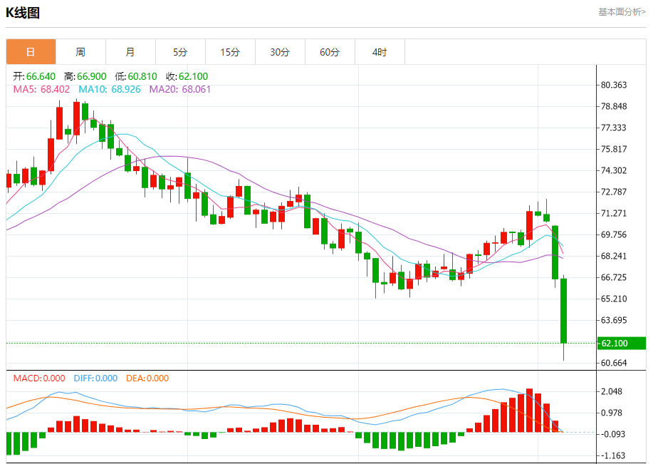 原油市场:截止北京时间20:18,美油下跌,现报62.110,跌幅7.21%。纽市盘前,美国原油价格在主要下行趋势占主导地位的情况下,在盘中水平自由下跌,价格突破了当前63.10美元的支撑,因为尽管在超卖水平上结算,但随机指标仍出现了负面信号,表明了抛售势头的强度。