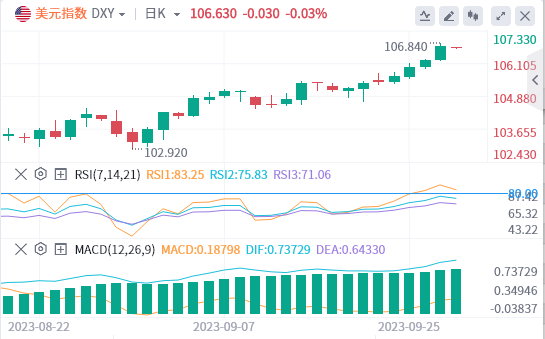 美元指数:截止发稿,美元指数窄幅震荡,现报106.63,跌幅0.03%。从基本面来看,美元对所有其他主要货币走高,并在今天继续保持强势,美元指数创下了10个月来的新高。美联储的“更长时间保持利率更高”思路仍在为美元提供动力,同时也推高了国债收益率。由于数据显示经济具有更强的抗压能力,因此可以承受更多的加息,10年期基准利率本周二飙升至16年来的新高。技术面上,RSI技术指标呈现进一步上升趋势。在106.43之上看涨,目标价位为106.84,然后为107。