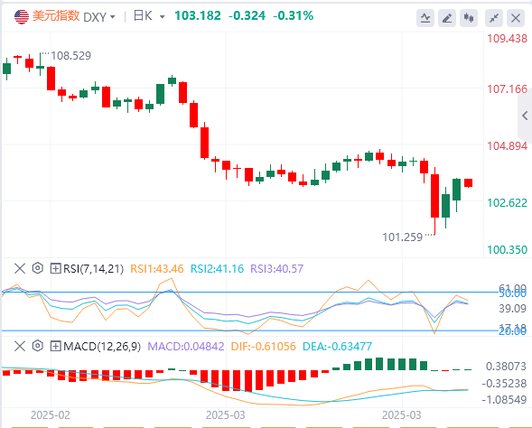 美元指数:截止发稿,美元指数徘徊在103.18附近。市场最初因美国考虑对除中国以外所有国家实施90天关税暂停的报道而上涨,国家经济委员会(NEC)主任凯文·哈塞特(KevinHassett)透露了这一消息。在白宫发言人驳斥该报道为不实后,乐观情绪短暂消退,避险资金流入再度升温,拖累股市下跌。技术面上,如果美元指数成功收于103.20–103.40的阻力位上方,它将向位于104.50–104.65区间的下一个阻力位移动。