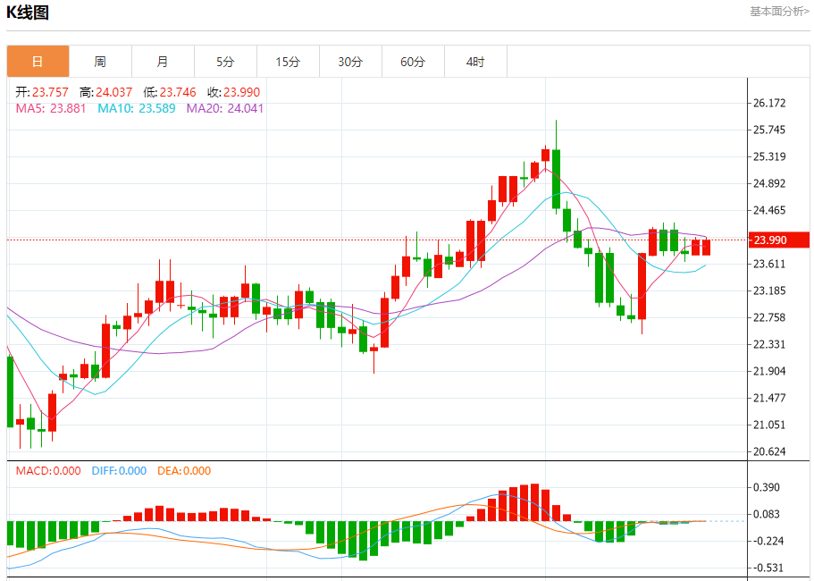 现货白银:截止北京时间21:25,现货白银上涨,现报23.990,涨幅0.90%。纽市盘前,白银价格显示平静的积极交易远离23.70水平,这支持了今天预期的牛市趋势的延续,提醒你我们主要等待的目标位于24.60,而实现它需要持有23.70以上。