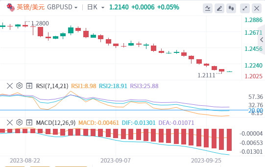 英镑:截止发稿,英镑/美元徘徊于1.2140附近。昨日英镑/美元下跌,收报1.2157,跌幅0.44%。英镑/美元将成为本周投资者最关注的焦点,英国第二季度的GDP预计将与之前的0.2%持平,但周五的行动可能会被美国个人消费支出(PCE)价格指数所掩盖。技术面上,技术指标深陷超卖区间,RSI指标处于自2022年9月以来14天滚动时间表上的最低值,跌至1.0840。200天SMA目前位于1.2400以北,34天指数移动平均线已大幅下跌,并将与较长的MA形成看跌交叉。