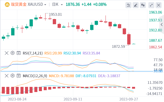 美元指数:截止发稿,美元指数交投于106.63附近。美元对所有其他主要货币走高,并在今天继续保持强势,美元指数创下了10个月来的新高。美联储的“更长时间保持利率更高”思路仍在为美元提供动力,同时也推高了国债收益率。由于数据显示经济具有更强的抗压能力,因此可以承受更多的加息,10年期基准利率本周二飙升至16年来的新高。技术面上,RSI技术指标呈现进一步上升趋势。在106.43之上看涨,目标价位为 106.84,然后为107 。