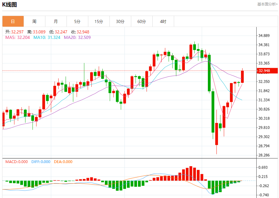 现货白银:截止北京时间20:16,现货白银上涨,现报32.946,涨幅2.05%。纽市盘前,白银价格在盘中水平上涨,达到我们的价格目标32.90美元,受到短期看涨修正趋势的支撑,并沿着陡峭的趋势线交易,RSI上出现积极信号。