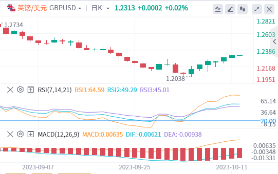 欧元:截止发稿,欧元/美元徘徊于1.0625附近。昨日欧元/美元收高,收报1.0605,涨幅0.13%。目前预期美联储(Fed)将在今年余下时间将利率维持在当前水准。同时,市场参与者也在猜测欧洲央行(ECB)暂停政策调整的前景,尽管通膨水准高於该行的目标,而且对欧洲地区未来经济衰退或滞胀风险的担忧也在加剧。技术面上,汇价上行的初步阻力位于1.0642,进一步阻力位于1.0666,关键阻力位于1.0698;汇价下行的初步支撑位于1.0587,进一步支撑位于1.0555,更关键支撑位于1.0532。