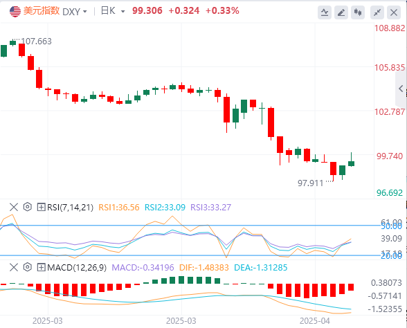 4月23日,北京时间周三亚市早盘,美元指数徘徊在99.30附近。周二,在对美国关税贸易谈判的乐观预期下,美元指数较低点反弹近百点 ,最终收涨0.634%,报98.98。美债收益率涨跌互现,基准的10年期美债收益率收报4.4%;对货币政策更敏感的两年期美债收益率收报3.825%。由于全球贸易紧张局势缓和提振了风险情绪以及美元走强,现货黄金冲高回落,盘中历史性地触及3500美元关口后急坠逾130美元,最终收跌1.24%,报3382.17美元/盎司。现货白银同样呈倒V走势,再次挑战33美元关口失败,最终收跌0.59%,报32.48美元/盎司。随着美国对伊朗实施新制裁和股市上涨,国际原油从前一交易日的大幅抛售中反弹。WTI原油一度站上64关口,最终收涨1.28%,报63.41美元/桶;布伦特原油收涨1.06%,报66.44美元/桶。