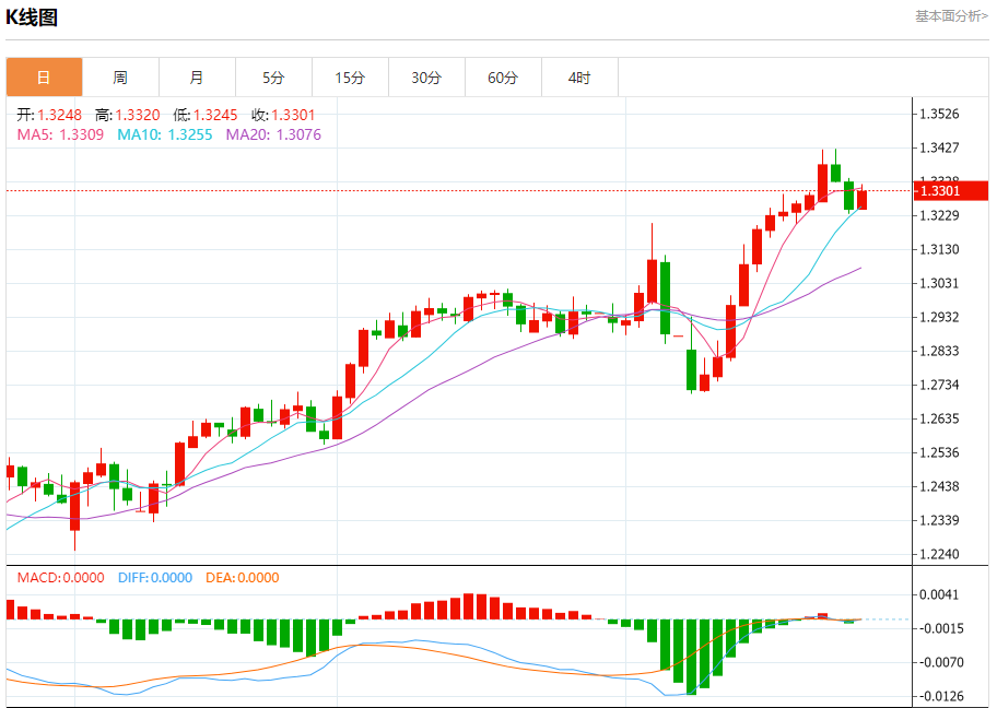 英镑/美元:截止北京时间20:20,英镑/美元上涨,现报1.3302,涨幅0.37%。纽市盘前,GBPUSD在最后一个交易日上涨,价格试图形成上涨的低点,这可能形成一个技术支撑基础,帮助它重新获得完成牛市轨道所需的积极势头。