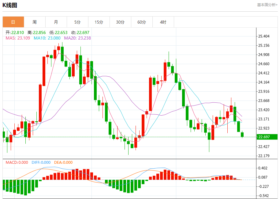 现货白银:截止北京时间20:21,现货白银下跌,现报22.710,跌幅0.53%。纽市盘前,受随机利好影响,白银价格显示出轻微的看涨倾向,但只要价格低于23.00,我们今天的看跌观点将保持活跃,这得到了EMA50的持续支持,提醒您我们的下一个主要目标位于22.25。