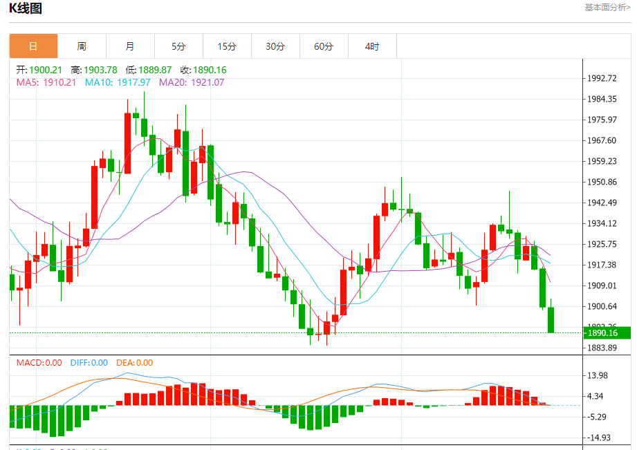 现货黄金:截止北京时间20:21,现货黄金下跌,现报1890.45,跌幅0.52%。纽市盘前,黄金价格持续下跌至1900.00关口下方,强化了今天剩余时间继续看跌趋势的预期,提醒您我们等待的目标位于1890.00和1875.00,而熊市的持续取决于1913.15下方的价格稳定性。