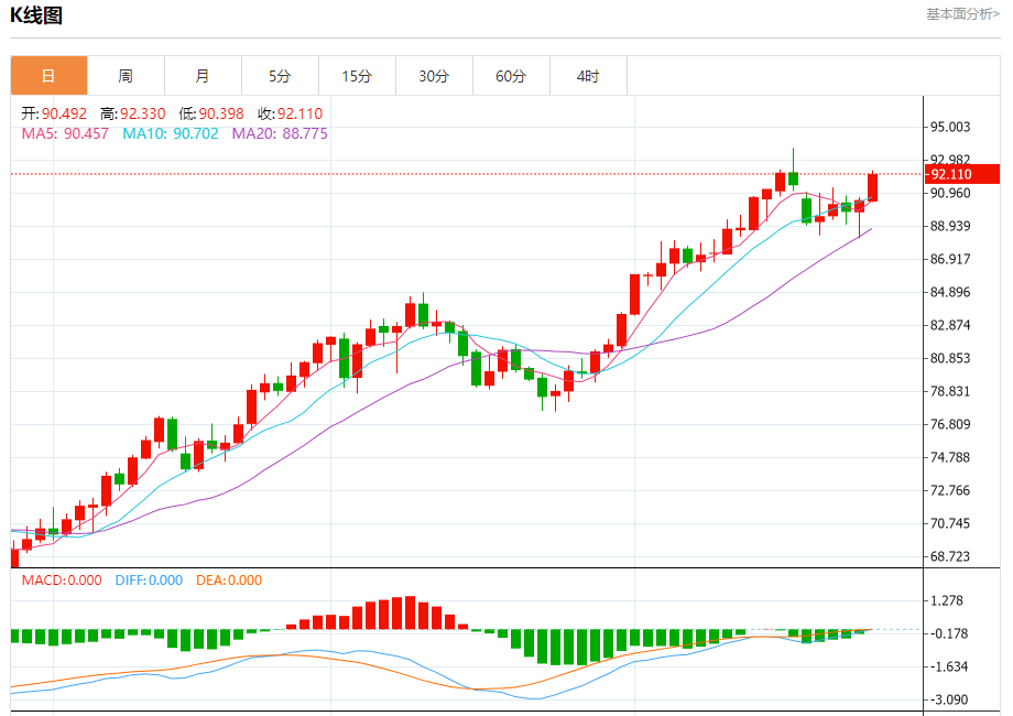 原油市场:截止北京时间20:21,美油上涨,现报92.117,涨幅1.77%。纽市盘前,原油价格恢复积极交易,以确认未来几个交易日看涨趋势的延续,实现我们在92.90的第一个目标的道路是开放的,突破该目标代表着向94.00反弹的关键,注意到EMA50继续支持建议的牛市,除非突破90.75并保持在其下方,否则将保持有效。