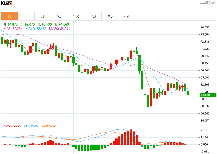 原油市场:截止北京时间20:20,美油下跌,现报61.060,跌幅1.60%。纽市盘前,原油在盘中水平下跌,突破61.50美元的支撑位,确认了卖方力量的主导地位,同时由于其在EMA50下方交易,以及其在短期基础上沿着看跌偏向线移动,导致负面压力的持续。