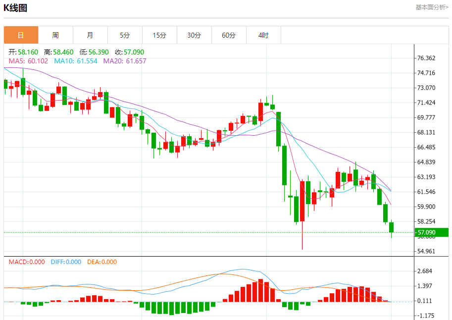 原油市场:截止北京时间20:02,美油下跌,现报57.050,跌幅1.96%。纽市盘前,原油在最后一个交易日下跌,达到我们的目标56.70,在短期基础上的熊市趋势占主导地位,并沿着斜线交易,在(RSI)上出现负面信号,尽管达到超卖水平。