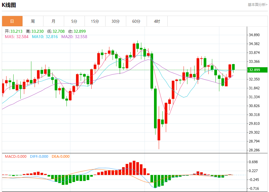 现货白银:截止北京时间20:20,现货白银下跌,现报32.902,跌幅0.87%。纽市盘前,在最近的盘中交易中,随着(RSI)上负面信号的出现,白银价格下跌,在达到超买水平后,价格试图获得积极的动力,这可能有助于其恢复并再次上涨,依靠EMA50。