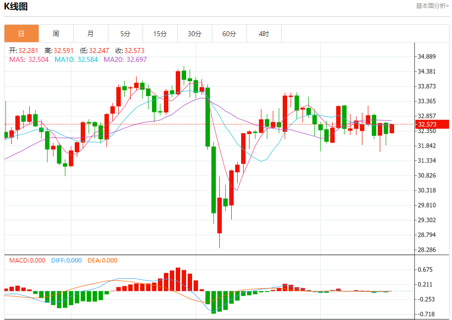 现货白银:截止北京时间20:20,现货白银上涨,现报32.581,涨幅1.01%。纽市盘前,(白银)价格在最近的盘中交易中下跌,受到达其EMA50阻力的影响,这是由于稳定低于当前阻力32.70美元,在(RSI)上出现的负重叠信号迫使价格在到达超买水平后反弹。