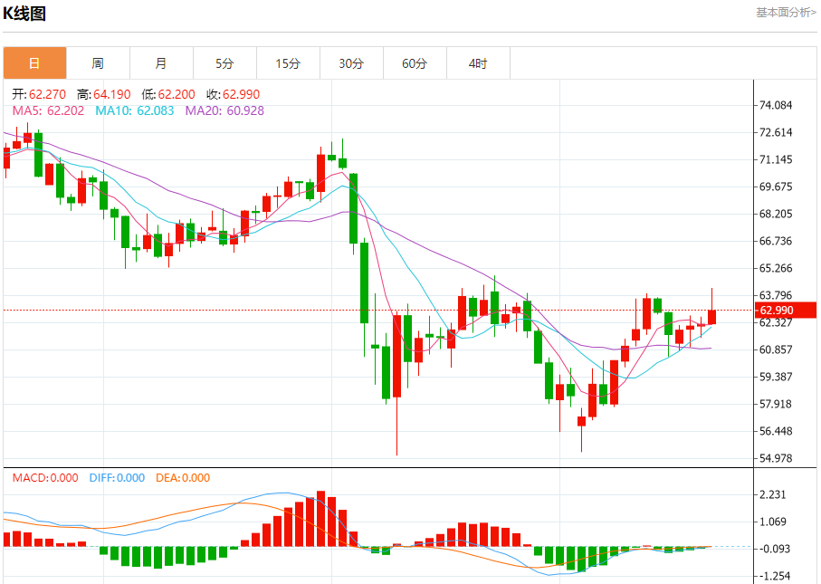 原油市场:截止北京时间20:18,美油上涨,现报63.000,涨幅1.60%。纽市盘前,(原油)价格在最近的盘中交易中小幅上涨,试图获得积极的动力,这可能有助于其突破63.50美元的关键阻力,因为短期内看涨修正趋势占主导地位,并沿着偏向线交易,其在EMA50上方的交易继续提供动态支持。