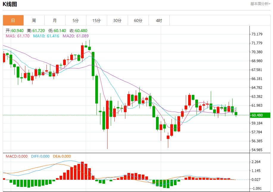 原油市场:截止北京时间20:20,美油下跌,现报60.430,跌幅0.82%。纽市盘前,(原油)价格在最近的盘中交易中出现波动,在达到超买水平后,由于(RSI)上出现的负面信号的压力,价格最近下跌,以依靠短期看涨趋势线,同时依靠EMA50的支撑,提供了一些积极的动力,帮助其稳定并反弹走高,保持看涨轨道。