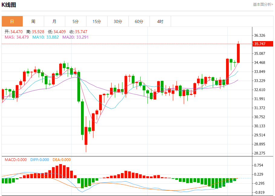 现货白银:截止北京时间20:27,现货白银上涨,现报35.768,涨幅3.75%。纽市盘前,(白银)价格在最后一个交易日飙升,突破了34.50美元的关键阻力位,为确认形成积极的技术形态提供了积极的动力,这是一种旗帜形态,为上行提供了推动力,以达到35.50美元的目标,在短期主要看涨趋势占主导地位的情况下超越了当前的价格,并沿着一条斜线交易,尽管达到了夸大的超买水平,但(RSI)上出现了积极的信号。