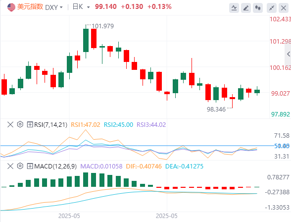 周一,在投资者密切关注中美贸易谈判之际,美 元指数震荡走低,盘中一度下破99关口,截至目前,美元报价99.14。