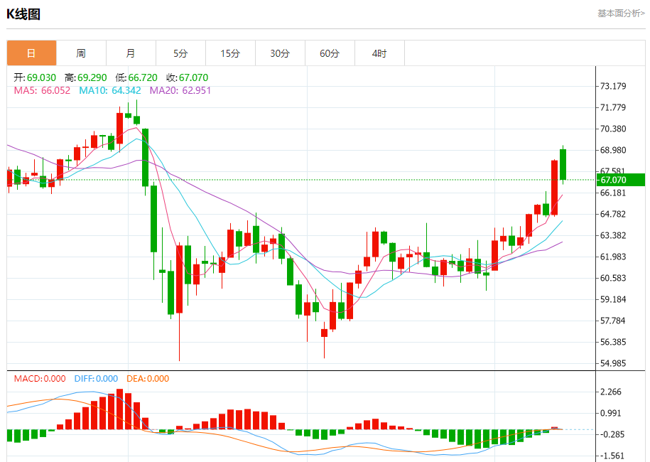 原油市场:截止北京时间20:20,美油下跌,现报67.060,跌幅1.60%。纽市盘前,(原油)价格在最近的盘中交易中下跌,在达到超买水平后,在(RSI)上出现负面信号,试图寻找更高的低点,以此作为基础,可能有助于其获得所需的积极复苏势头,在短期内主要看涨趋势占主导地位,沿着斜线,继续从EMA50上方的交易中获得积极的支持。