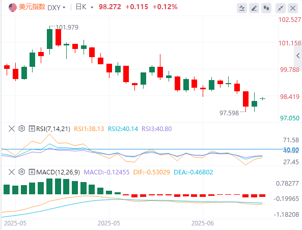 美元指数:截止发稿,美元指数徘徊在98.27附近。美元兑欧元和日元等主要货币上周五上涨,以色列袭击伊朗导致中东地缘政治紧张局势加剧,市场纷纷买入避险资产。市场将聚焦本周美联储决议,市场普遍预计美联储将维持利率不变,投资者将关注联储的最新预测,这些预测将揭示政策制定者对近期疲软数据的重视程度,以及他们认为悬而未决的贸易和预算问题以及中东冲突加剧造成何种程度的风险。技术面上,如果美元指数回到99.00–99.20的支撑位下方,它将向位于96.70–96.90区间的下一个支撑位移动。