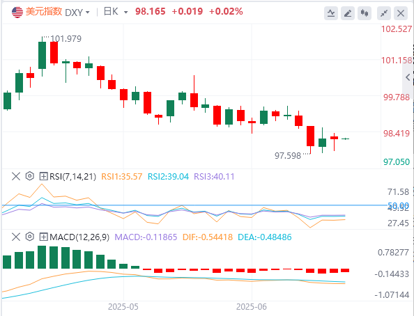 6月17日,北京时间周二亚市早盘,美元指数徘徊在98.16附近。周一,因投资者对美联储会议持谨慎态度,美元指数持稳,在欧盘下破98关口后收复失地,最终收跌0.21%,报99.01。基准的10年期美债收益率收报4.4560%,2年期美债收益率收报3.9830%。因交易员获利了结,现货黄金在触及八周高点后下跌逾1%,最终收跌1.40%,收报3385.30美元/盎司;现货白银最终收涨0.06%,报36.32美元/盎司。由于有报道称伊朗正寻求结束与以色列的敌对行动,国际油价周一下跌逾1美元。WTI原油最终收跌4.01%,报69.99美元/桶;布伦特原油收跌2.61%,报72.44美元/桶。