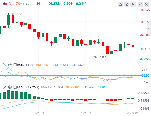 6月20日,北京时间周五亚市早盘,美元指数徘徊在98.58附近。周四,因市场担忧伊以冲突升级,避险情绪得到提振,美元指数盘中触及99关口,最终收跌0.04%,报98.86。美债收益率先跌后涨,基准的10年期美债收益率最终收报4.3960%,2年期美债收益率收报3.9540%。因投资者权衡美国通胀和中东局势,现货黄金持稳,最终收涨0.03%,报3370.31美元/盎司;现货白银最终收跌0.91%,报36.37美元/盎司。市场仍担忧“霍尔木兹海峡”潜在的封锁危机,WTI原油低开高走,一度触及76美元,但未能收复失地,最终收跌1.28%,报73.81美元/桶;布伦特原油大涨3.5%,报78.69美元/桶。