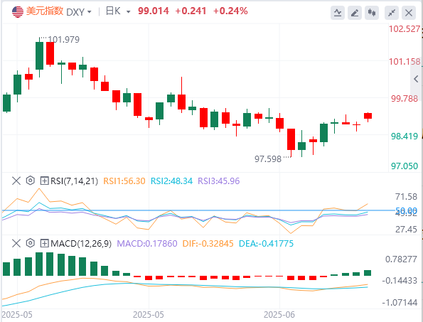 6月23日,北京时间周一亚市早盘,美元指数徘徊在99.01附近。上周五,由于中东战事的不确定性及其可能对全球经济造成的影响,美元指数创逾一个月最大周线涨幅,日线持平,最终收跌0.01%,报98.77。美元指数周一盘初走强约0.5%,随后回落;基准的10年期美债收益率上周五收报4.3830%,2年期美债收益率收报3.9160%。虽然地缘政治风险上升为金价带来支撑,但美国通胀预期的上升和美联储的谨慎立场影响了市场对美联储今年降息次数的预期,现货黄金上周五走势持稳,最终收跌0.07%,报3371.39美元/盎司。受美国空袭伊朗三大核设施、特朗普反问伊朗政权为何不能进行更迭等因素影响,现货黄金周一高开24美元,最高至3398美元/盎司。上周五,现货白银收跌1.9%,报36.02美元/盎司。WTI原油上周五开盘冲高回落,最终近乎回吐日内全部涨幅,收涨0.2%,报73.96美元/桶;受中东局势升级影响,WTI原油周一高开3.7%。布伦特原油上周五收跌1.93%,报77.17美元/桶,周一高开1.8%。