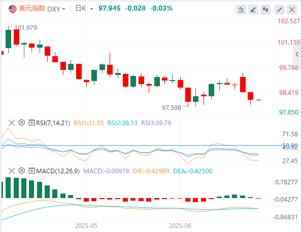 6月25日,北京时间周三亚市早盘,美元指数徘徊在97.94附近。周二,因特朗普宣布伊以停火的消息打击了避险买盘,美元指数亚盘、欧盘持续下跌近0.50%,失守98关口,后因鲍威尔暗示他将抵制7月降息的呼吁而小幅回升,最终收跌0.40%,报97.96。基准的10年期美债收益率收报4.2960%,2年期美债收益率收报3.8310%。因伊以停火打击避险情绪,以及鲍威尔称在考虑降息前需要更多时间,现货黄金一度跌破3310美元关口,最终收跌1.67%,收报3322.82美元/盎司;现货白银最终收跌0.46%,报35.90美元/盎司。由于市场预期伊以停火将降低中东石油供应中断的风险,油价下跌6%,创两周新低。WTI原油盘中一度回落至64美元/桶下方,最终收跌3.35%,报64.96美元/桶;布伦特原油收跌3.7%,报67.73美元/桶。