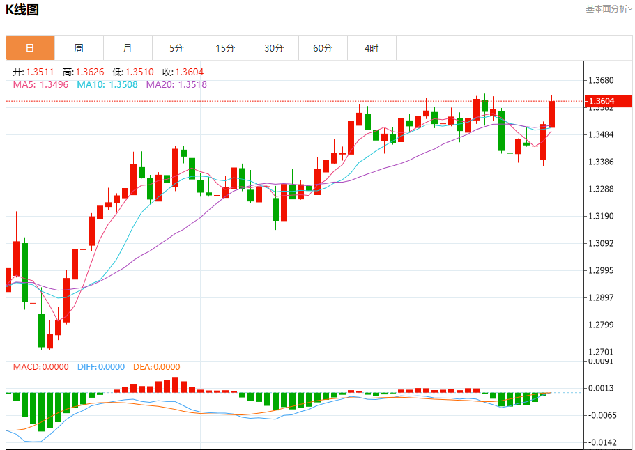 英镑/美元:截止北京时间20:23,英镑/美元上涨,现报1.3605,涨幅0.61%。纽市盘前,(GBPUSD)价格在最后一个交易日继续大幅下跌,以确认在短期基础上形成一条新的看涨趋势线,利用突破其EMA50的阻力,EMA 50此前形成了一个动态障碍。