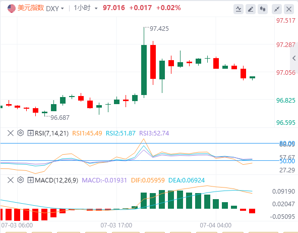 7月4日,北京时间周五亚市早盘,美元指数徘徊在97.01附近。周四,因美国就业数据强劲打消了市场对美联储近期的降息预期,美元指数在美盘前大幅上涨,再回97关口上方,并一度涨至97.42的日内高点,最终收涨0.32%,报97.08;基准的10年期美债收益率收报4.351%,2年期美债收益率收报3.892%。现货黄金则大幅回落,盘中一度跌至3311.65美元,较日高大跌超50美元,随后收复部分失地,最终收跌0.94%,收报3325.50美元/盎司;现货白银虽有所回落但反弹剧烈,最终收涨0.78%,报36.82美元/盎司。在不确定性笼罩之下,两油陷入区间。WTI原油在66美元附近来回震荡,最终收跌0.58%,报66.23美元/桶;布伦特原油收跌0.39%,报68.51美元/桶。