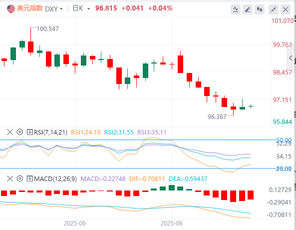 周三,美元指数小幅反弹,盘中一度重回97关口 上方,但随后回吐部分涨幅,截至目前,美元报价96.81。