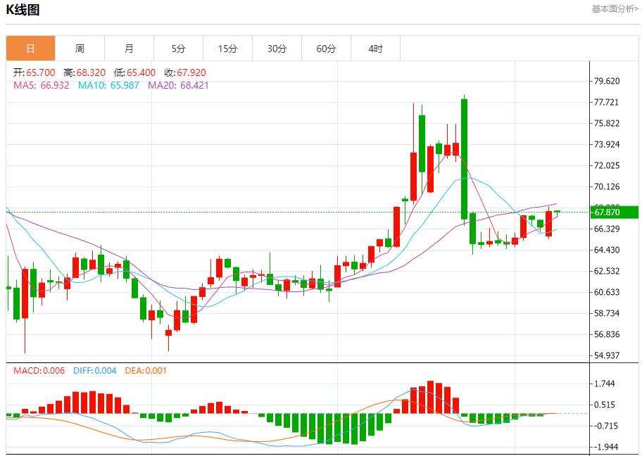 原油市场:截止北京时间20:23,美油下跌,现报67.860,跌幅0.07%。纽市盘前,(原油)价格在最近的盘中水平略有上涨,波动的交易有助于其摆脱(RSI)的超买状况,这些状况阻止了其在关键支撑位66.00美元上方的稳定上涨,利用了其在EMA50上方的稳定性所代表的动态支撑。