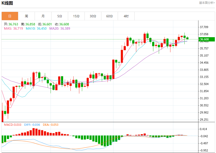 现货白银:截止北京时间20:23,现货白银下跌,现报36.613,跌幅0.39%。纽市盘前,(白银)价格在最近一个交易日的水平上波动交易,来自EMA50上方交易的积极压力持续存在,在主要看涨趋势的主导下,以及在短期基础上沿着一条小斜线交易,这使得这种积极的情况动态稳定。另一方面,我们注意到在达到超买水平后出现了消极的重叠信号,由于需要卸载一些超买条件,这种信号减缓了上行轨道。