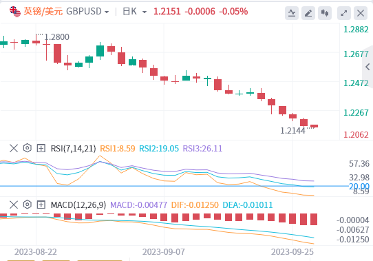欧元:截止发稿,欧元/美元徘徊于1.0571附近。昨日欧元/美元下跌,收报1.0572,跌幅0.20%。令欧元雪上加霜的是欧洲央行(ECB)内部的利率周期僵局。欧洲央行的投票成员已经达成共识,即最好避免进一步加息,因为央行正在等待当前利率产生预期效果的证据。技术面上,汇价上行的初步阻力位于1.0597,进一步阻力位于1.0626,关键阻力位于1.0644;汇价下行的初步支撑位于1.0549,进一步支撑位于1.0531,更关键支撑位于1.0502。