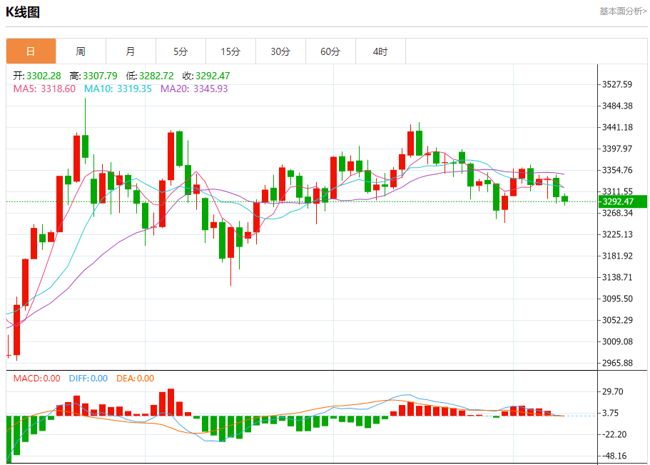 现货黄金:截止北京时间19:16,现货黄金下跌,现报3292.63,跌幅0.26%。纽市盘前,受短期看跌修正趋势主导影响,(黄金)价格在最后一个盘中继续下跌,并沿着偏向线交易,由于价格稳定在EMA50下方,负压仍然有效,表明看涨势头疲软。