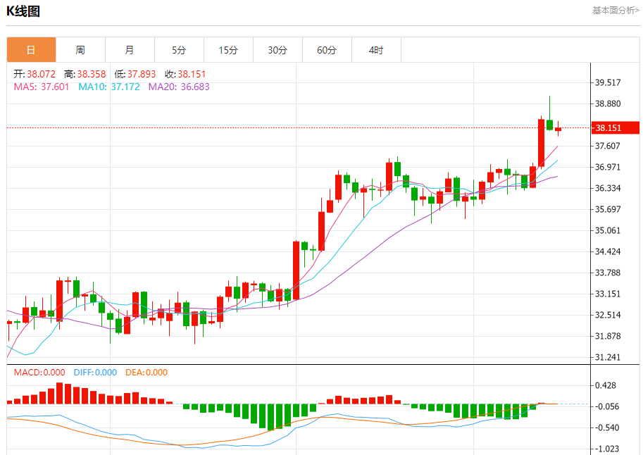现货白银:截止北京时间20:23,现货白银上涨,现报38.130,涨幅0.07%。纽市盘前,(白银)价格在最近一个交易日内经历了波动交易,此前其下跌的目标是寻找一个上涨的低点,以此为基础,以此为基础,帮助其获得恢复所需的积极动力,注意到在达到超卖水平后,形成了(RSI)的积极背离,从那里开始出现积极信号,这是在短期基础上的主要看涨趋势占主导地位及其沿着趋势线交易的情况下出现的。