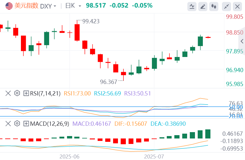 周二,在温和的通胀报告引发美联储可能暂时维持利率不变的猜测后,美元指数持续拉升,截至目前,美元报价98.57。