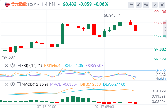 7月18日,北京时间周五亚市早盘,美元指数徘徊在98.43附近。周四,随着围绕鲍威尔解雇风波的紧张情绪有所平息,且美国经济数据强劲,美元指数走高,最终收涨0.37%,报98.61。美债收益率涨跌不一,基准的10年期美债收益率收报4.457%,2年期美债收益率收报3.913%。现货黄金在美国“恐怖数据”大超预期后跳水,一度跌破3310美元关口,随后跌幅有所收窄,最终收跌0.25%,收报3347.6美元/盎司;现货白银反弹更加显着,最终收涨0.62%,报38.14美元/盎司。由于美国经济数据缓解了人们对石油需求恶化的部分担忧,国际油价止步三连跌。WTI原油站上66关口,最终收涨1.33%,报66.31美元/桶;布伦特原油收涨1.66%,报68.9美元/桶。