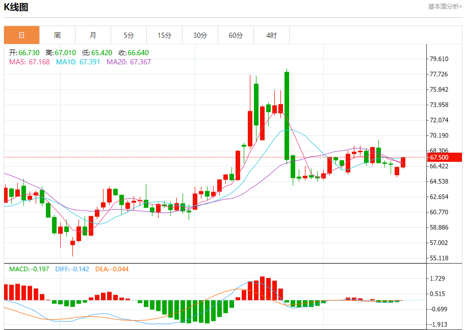 原油市场:截止北京时间20:23,美油上涨,现报67.490,涨幅1.92%。纽市盘前,(原油)在最后一盘交易中收盘强劲上涨,受到试图收复之前损失的支撑,价格重新测试了小看涨通道的支撑位,该支撑位在短期基础上限制了前一交易的价格,并触及EMA50的阻力位,这增加了技术压力,可能会限制这种上涨的继续。