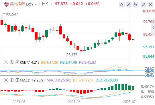美元指数:截止发稿,美元指数徘徊在97.87投资者正在对8月1日最后期限之前重新出现的贸易紧张局势和普遍谨慎的市场情绪做出反应。尽管最近美国经济数据基本稳健,但美元仍感受到了围绕美国总统唐纳德·特朗普政府加大关税威胁的持续不确定性以及美联储降息政治压力不断增加的热度。美元受到上周强劲的美国经济数据的支持,这降低了美联储(Fed)立即降息的可能性。技术面上,美元指数正试图收于支撑位98.00–98.20下方。如果这一尝试成功,美元指数将走向下一个支撑位,即位于96.70–96.90区间。